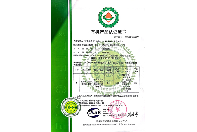有机产品认证证书